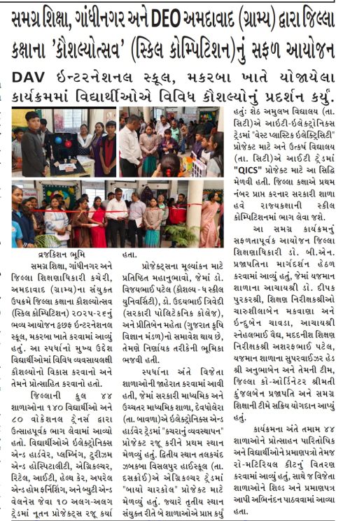 • A district-level 'Kaushalyotsav' (Skill Competition) was successfully organized by Samagra Shiksha, Gandhinagar, and DEO Ahmedabad (Rural) at DAV International School, Makarba
